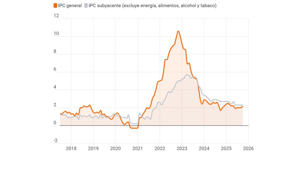 Inflationen fortsätter att inte ge några stora överraskningar i eurozonen, till lättnad för Europeiska centralbanken (ECB) som har haft några turbulenta år. I september steg konsumentprisindex (KPI) i eurozonen med två tiondelar till 2,2 % på årsbasis, vilket var i linje med förväntningarna. Liksom förväntat låg den mest ”klibbiga” och bevakade kärninflationen (exklusive energi, livsmedel, alkohol och tobak) för femte månaden i rad på 2,3 % på årsbasis, enligt uppgifter som Eurostat publicerade på onsdagen. Dessa uppgifter tycks motivera den centralbankens bekväma situation, med en inflation som ligger mycket nära målet på 2 %. Mot bakgrund av denna uppenbara lugn tyder allt på att Eurobanco kommer att insistera på sin ”goda position”, lämna räntorna på 2 % och för närvarande avfärda scenariot med en kommande sänkning.