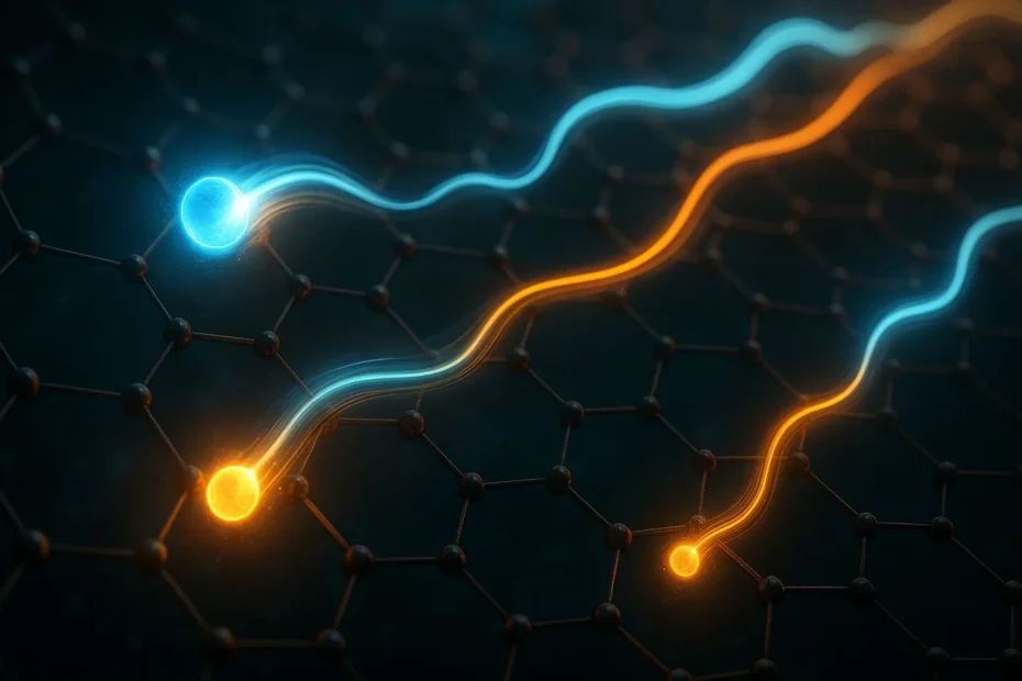 Artikeln beskriver ett experiment där elektroner i dubbla lager grafen inducerades att flöda på ett sätt som efterliknar ljusets utbredning. Det är varken ett ordspel eller en överdriven tolkning: det är ett verkligt kvantfenomen som observerats och mätts i laboratorium. Forskarna lyckades få elektronerna att ”böja sig” i dubbla lager grafen med hjälp av ljus. Denna förmåga att kontrollera elektronernas bana med fotonisk precision tyder på ett nytt sätt att förstå hur partiklar beter sig i vissa material, med möjliga långsiktiga tekniska tillämpningar.