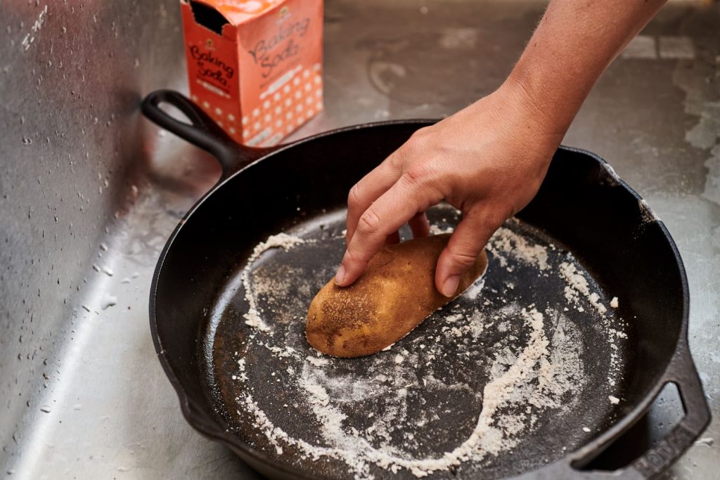 - Gnugga stekpannans yta: Gnugga potatisen generöst med den skurna sidan mot stekpannans smutsiga eller fläckiga yta. Potatisens stärkelse absorberar omedelbart fett och brända rester.