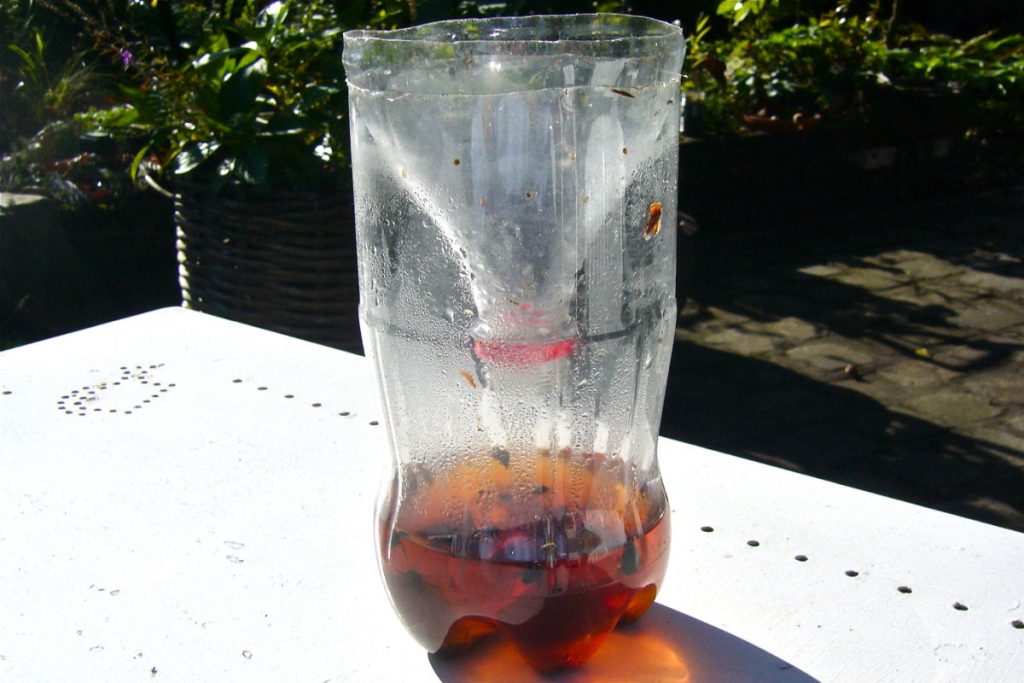 Man kan till exempel skära en plastflaska på mitten och vända den så att den fungerar som en tratt på den nedre delen, där man kan hälla äppelvinäger eller sockervatten.